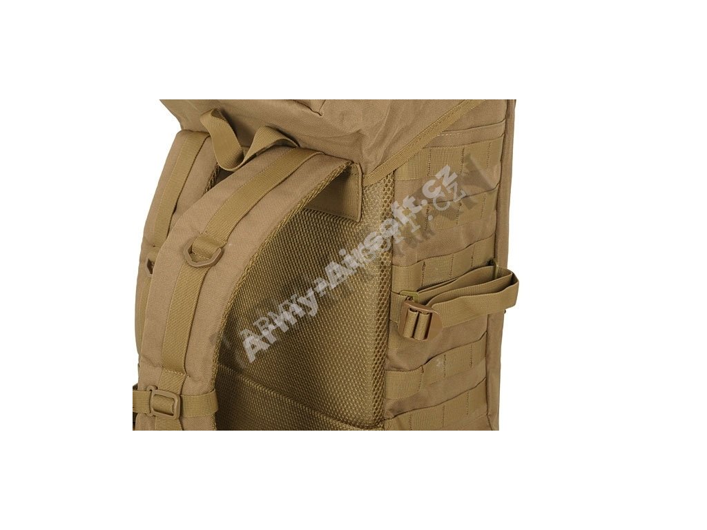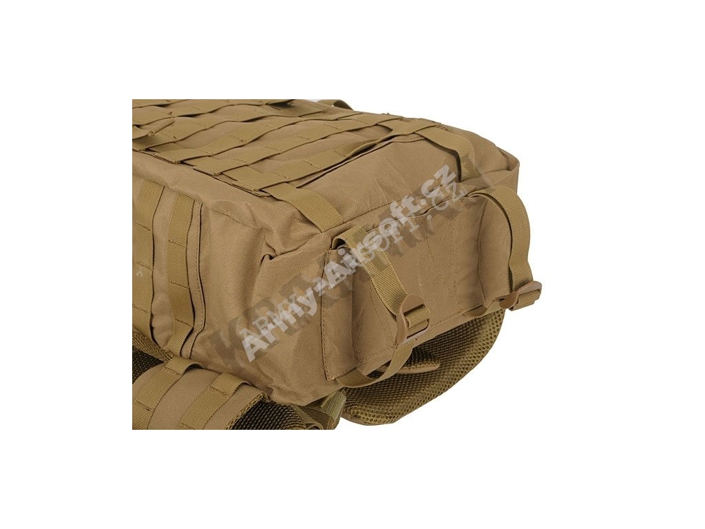 Velmi kvalitně zpracovaný batoh z nepromokavého a odolného materiálu proti roztržení nylon 600D. Taktický MOLLE úchytný systém nabízí možnost uchycení spousty doplňku. Prostorná hlavní přihrádka se snadným horním přístupem, jenž umožňuje efektivní a rychlé balení. Hrudní popruh, široké popruhy a pásek zvyšují pohodlí na cestách. Batoh taktéž disponuje kompresními popruhy. Na spodní části batohu se nalézají popruhy umožnující přichycení kupříkladu spacího pytle.
