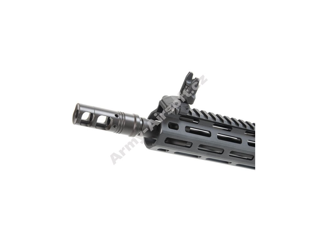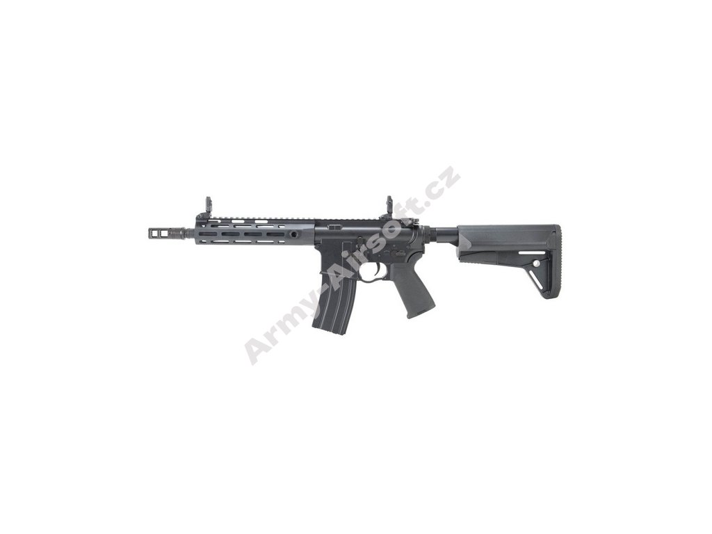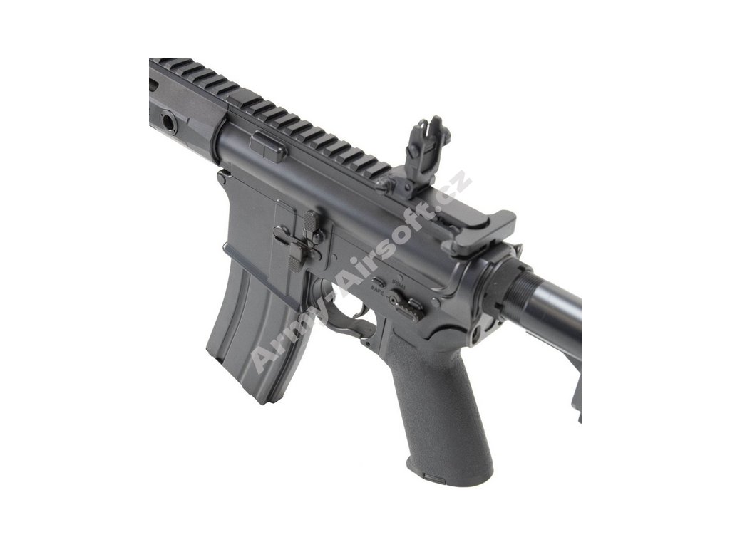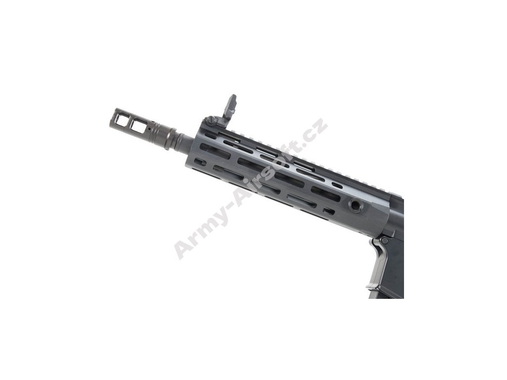 Airsoftová replika značky CYMA má celokovové tělo a kvalitní povrchovou úpravu. Předpažbí je vyrobeno z jednoho kusu a disponuje M-lok systémem pro montáž příslušenství. Ovládací prvky jsou oboustranné.