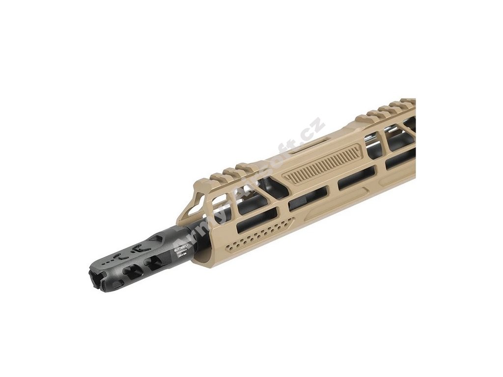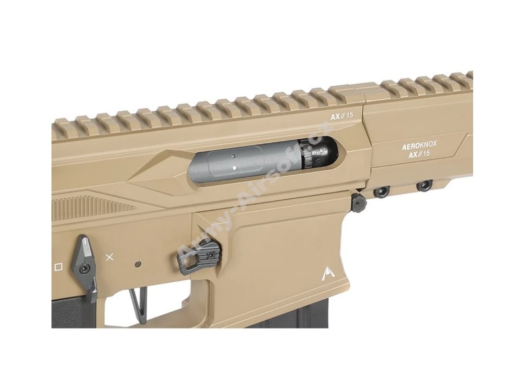 Spodní tělo z hliníku s oboustranným přepínačem režimu střelby, horní tělo s RIS lištou a tlumičem plamene BUTTERFLY — originální označení AEROKNOX.
