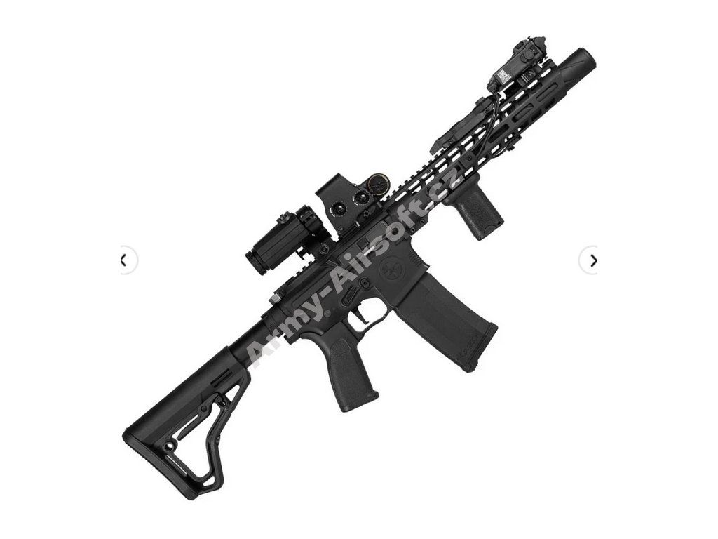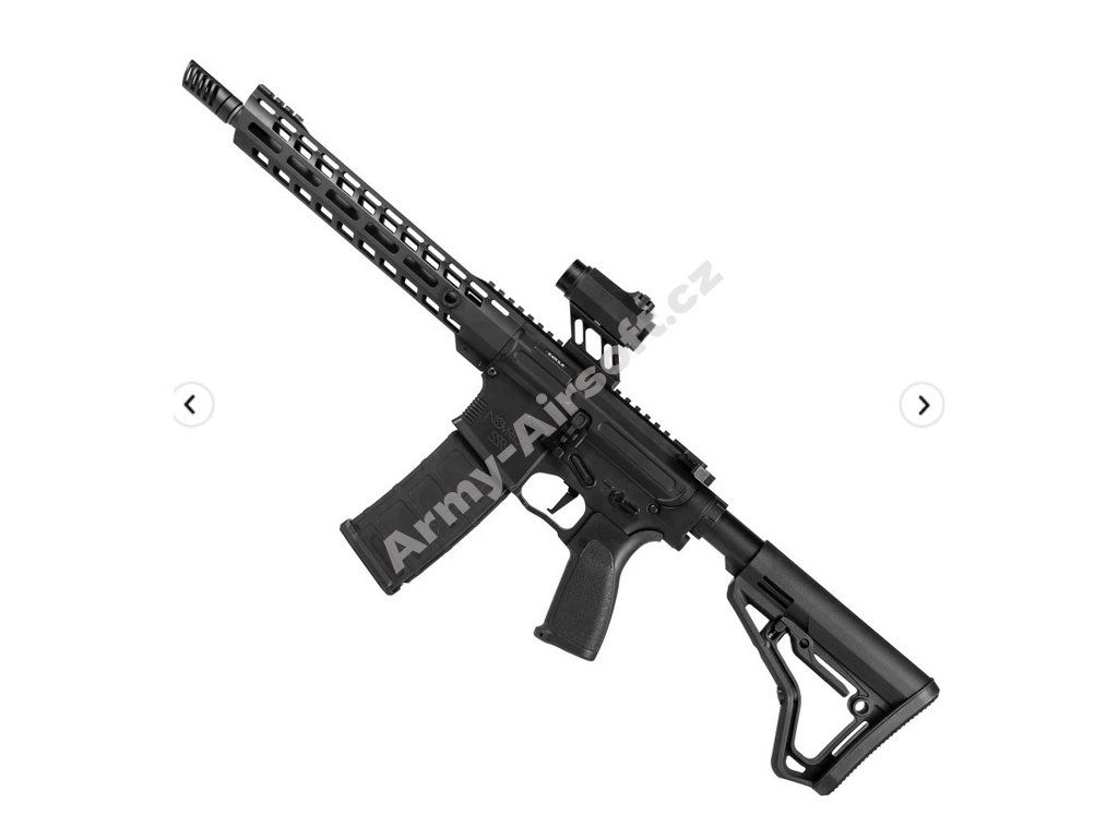 Základem zbraně je robustní kovové tělo platformy AR15 doplněné o CNC M-LOK předpažbí a horní RIS lištu, díky čemuž si ji snadno přizpůsobíte pomocí široké škály příslušenství. Ergonomie je dotažená do detailu – plochá spoušť (Flat Trigger), pohodlná pistolová rukojeť a nastavitelná pažba zajišťují komfort i při delším používání.