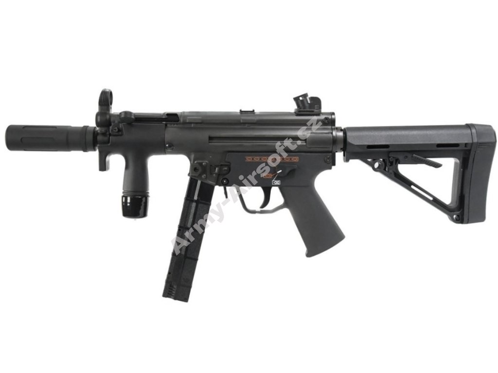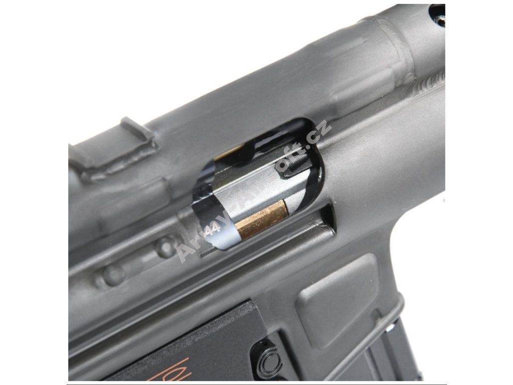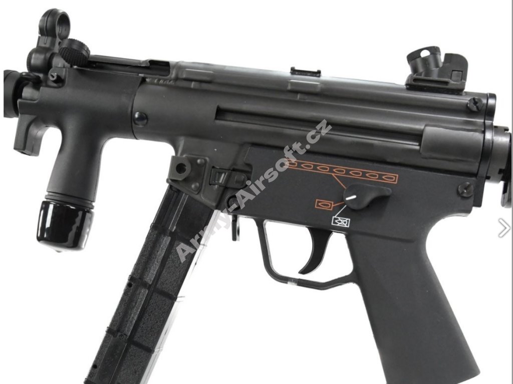 Pokud se bojíte atypického mechanismu, není důvod. Mechabox ve zbrani používá standardní díly pro mechabox verze 2. Je ovšem otázkou, zda budete mít důvod nějaké měnit. Vždyť silové díly jsou špičkové kvality a eloxované v zelené barvě. V mechaboxu najdete zátěžová kola BOLT, odlehčený duralový píst s celokovovým ozubením, CNC duralovou hlavu pístu a hlavu válce. Pouze trn pružiny má lehkou úpravou pro BRSS systém. Zbraně řady BOLT MP5 navíc využívají běžné zásobníky pro AEG zbraně.