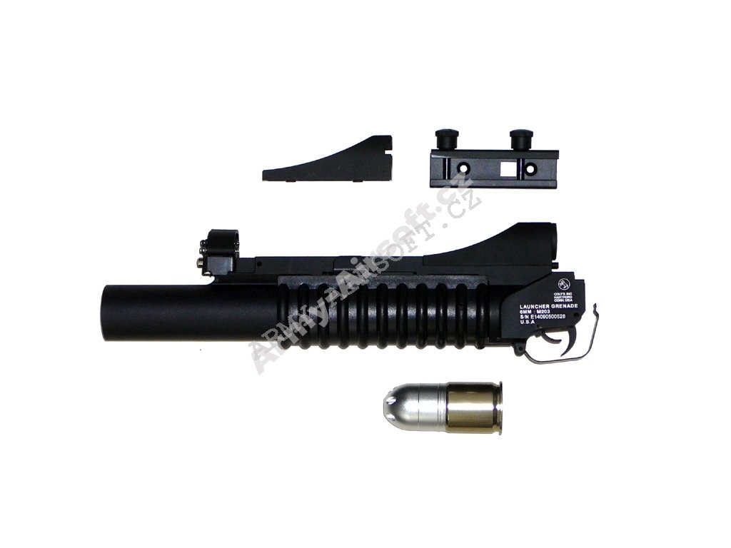 CyberGun - celokovový airsoftový podvěsný granátomet Colt M203 R.I.S. Granátomet je dodáván v setu s jedním kusem vložné patrony (kapacita 18 BB) a sadou výměných úchytů pro zbraně M16/M4 (systém uchycení hlavní TM i CA) a úchytem na R.I.S. lišty předpažbí. díky této sadě úchytů připojíte granátomet k většině zbraní standardu M16/M4. Granátomet je kompatibilní s vložnými patronami CyberGun či například velmi oblíbenými granáty firmy MadBull. Délka granátometu je 38cm a váží 1,37 kg.