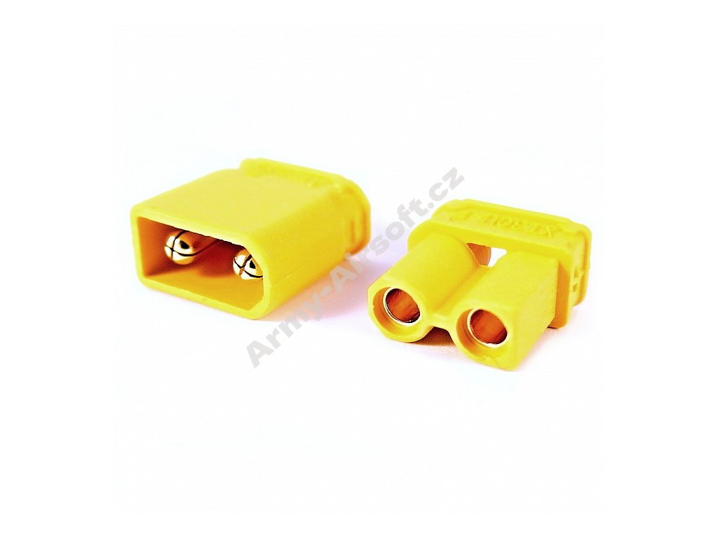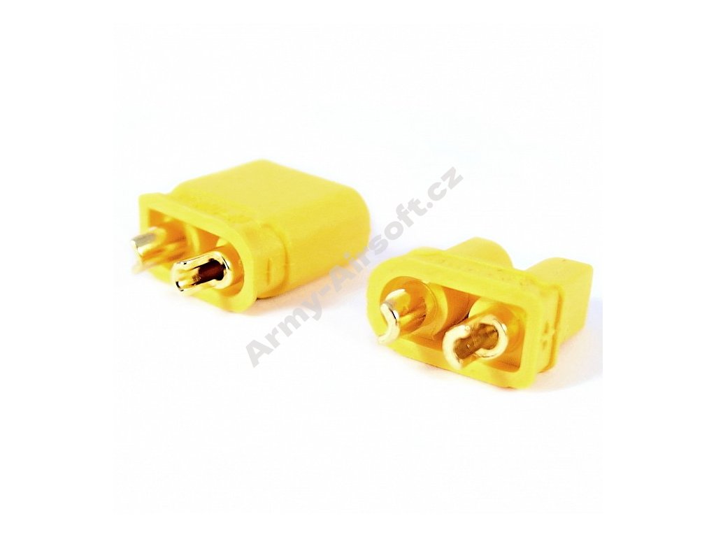 Robustní zlacený konektor s 2mm kulatými kontakty s velkou styčnou plochou pro proudy do 30 A. Nezáměnná polarita, kontakty zalisovány v houževnatém plastu spolehlivě odolávajícím teplotám při pájení a opotřebování v provozu. Doporučená náhrada za zastaralé a nevhodné konektory Tamiya. Rozměry: 13x11x6 mm. Po zapájení vodiců na konektor je nutné přetáhnout bužírkou 3,2mm, která není součástí balení, lze dokoupit v sekci bužírky.Obsah balení: 1ks samec a 1ks samice (viz foto) Použití a instalace konektoru: samec - určen k montáži na zbraň či nabíječku samice - určena k montáži na baterii V zaoblené části konektoru je minusová polarita (- značka na konektoru) U hranaté části konektoru je plusová polarita (+ značka na konektoru)