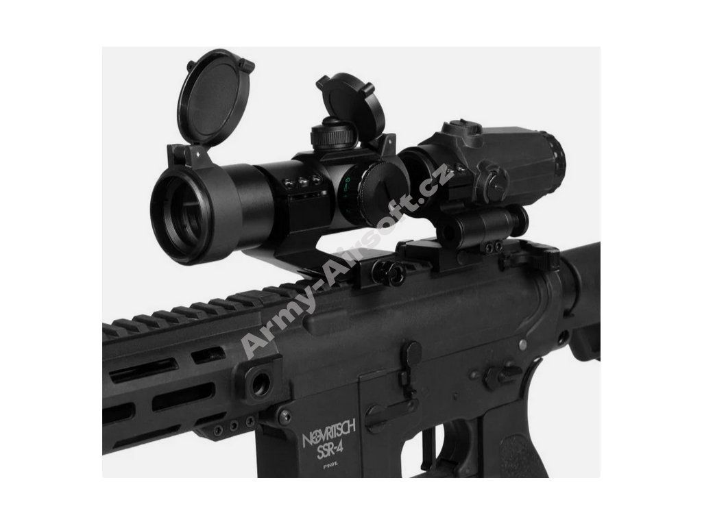 - Normálně používáš red dot (bez zvětšení) → ideální na CQB a rychlé reakce