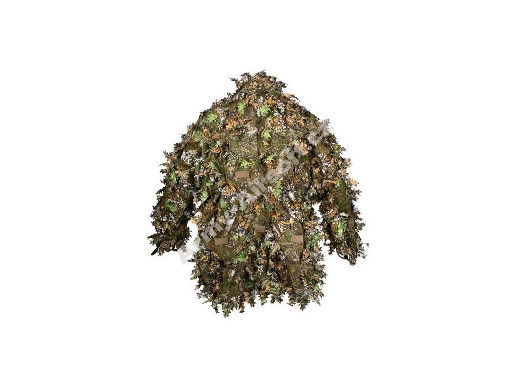 Okamžitá maskovací účinnost: Hustý 3D listový vzor přímo na blůze okamžitě narušuje lidskou siluetu. Četná poutka a oka umožňují přidání živé vegetace nebo doplňkových umělých listů (ANAREUS SilkLeaf, Novritsch LC System).