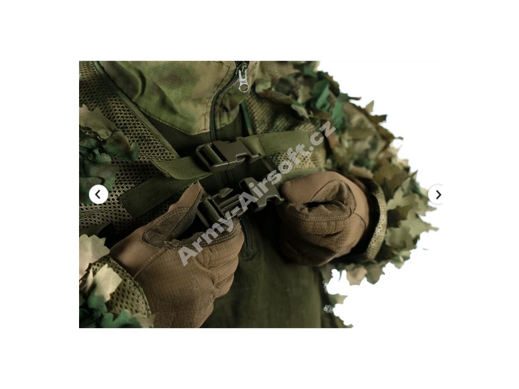 Převlečník kryje ramena, horní část trupu a ruce, zatímco hrudník a břicho zůstávají volné pro snadnou manipulaci se sumkami na nosiči plátů nebo chest rigu. Lehká síťovina s 3D listy rozbíjí siluetu postavy a pomáhá lépe splynout s okolním prostředím.