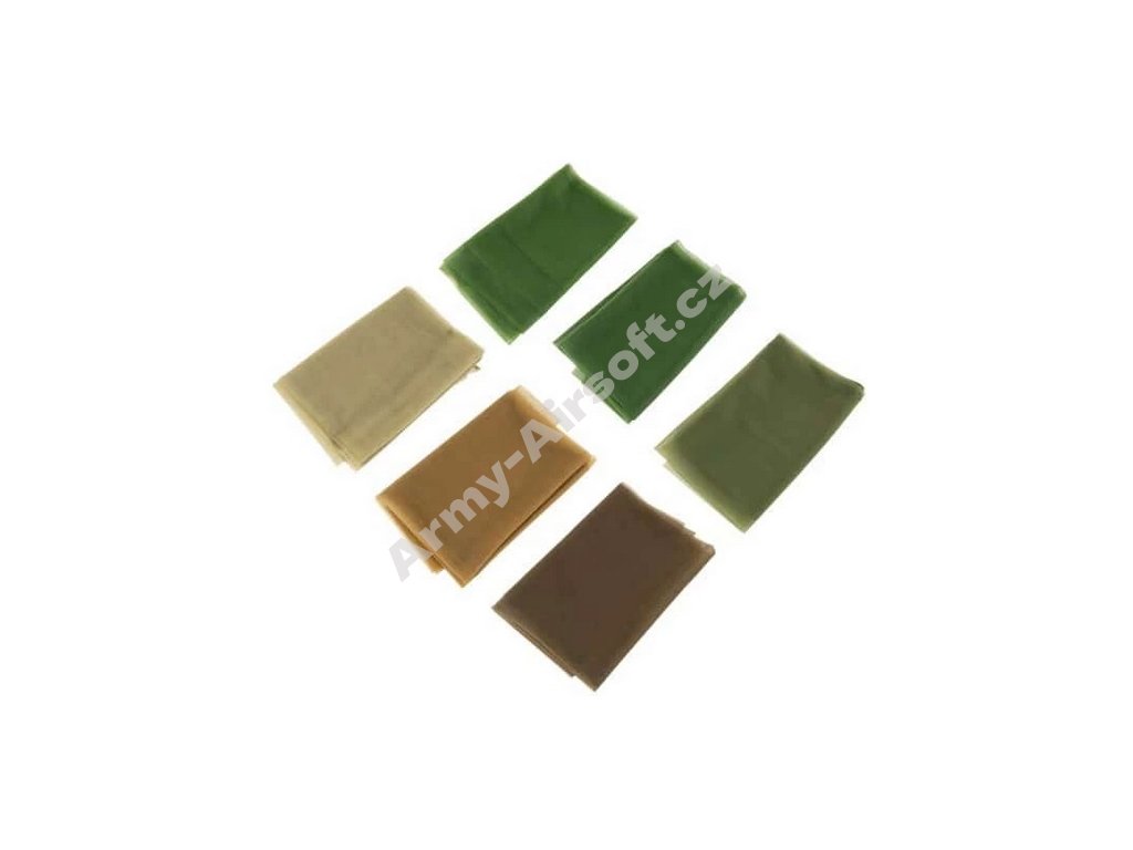 Sada obsahuje 6 různých odstínů maskovací tkaniny – od světlých pískových tónů až po tmavé zemité barvy. Díky tomu můžete vytvořit přirozené barevné přechody a dosáhnout maximálního splynutí s terénem. Lehký syntetický materiál je ideální pro použití na síťovinu, ghillie suit (hejkala), výstroj i maskování zbraní, aniž by omezoval pohyb nebo prodyšnost.