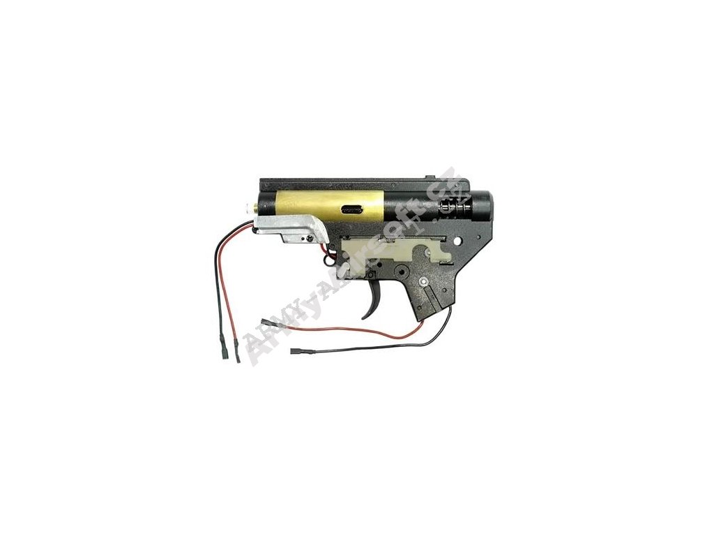 Kompletní mechabox typ 2. Shodný, jako dává firma Dboys do svých zbraní. Obsahuje tedy základní pružinu odpovídající cca M120, ozubená kolečka XYT, kuličková 7mm ložiska, plastovou protitlakou hlavu pístu, plastovovou trysku...apod. kabeláž je s vedením do předpažbí.