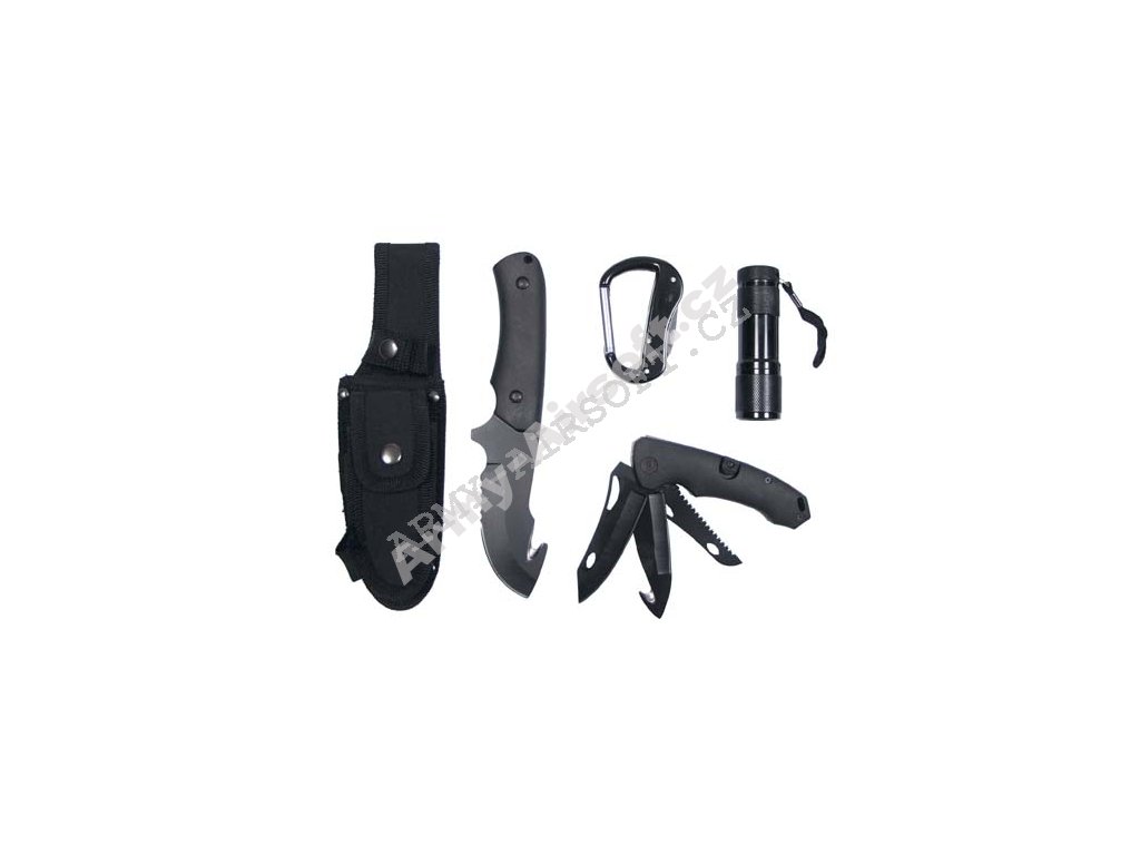 Nůž s pevnou čepelí + zavírací nůž + svítilna + karabina - ČERNÝ Army shop