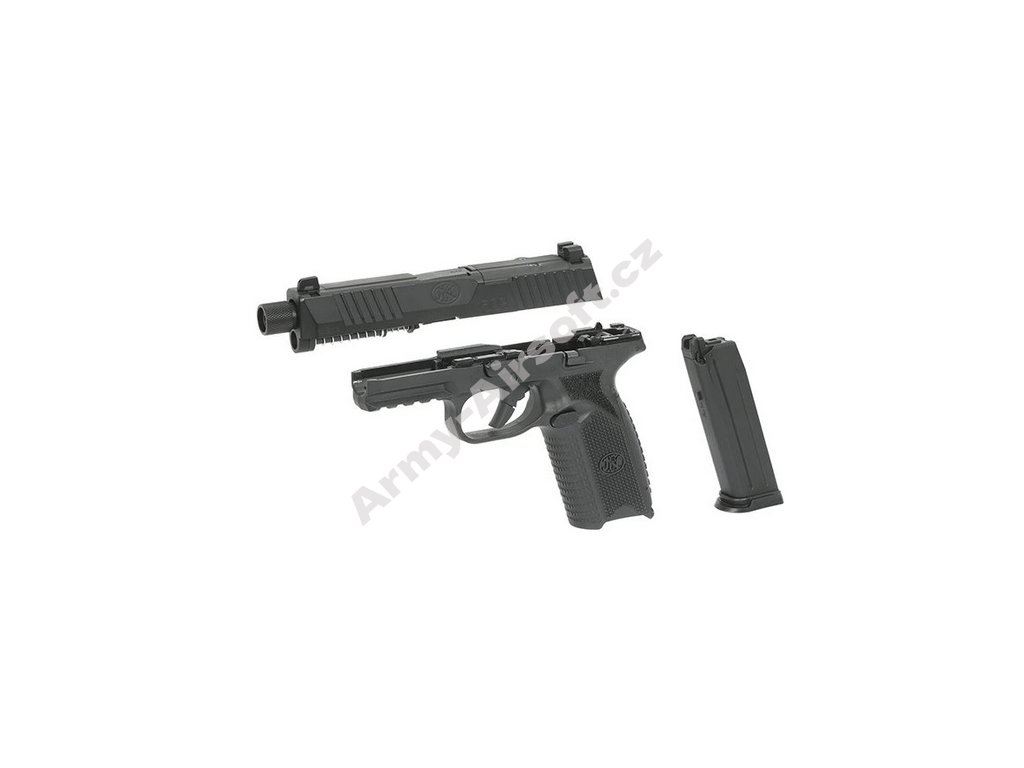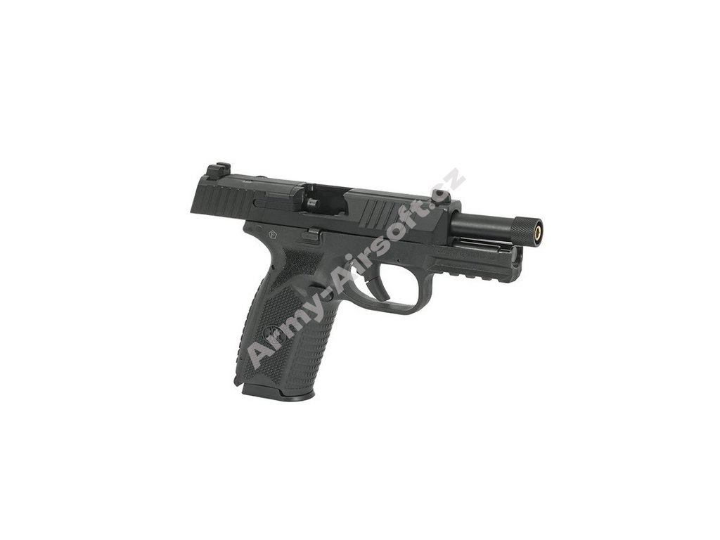 Luxusní plynová pistole GBB od Double Eagle na licenci FN Herstal. Model kombinuje realistické provedení, originální popisky FN, vysokou funkčnost a variabilitu. Závěr je upraven pro montáž kolimátoru RMR. Zvýšená mířidla, oboustranné ovládací prvky a ergonomická rukojeť s vyměnitelnými nástavci se dokonale přizpůsobí uživateli.