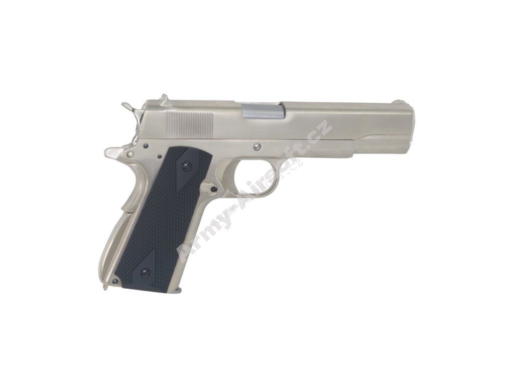 Jedná se o repliku slavné pistole M1911 ve stříbrném provedení s blow back systémem reálného pohybu závěru s imitací zpětného rázu.