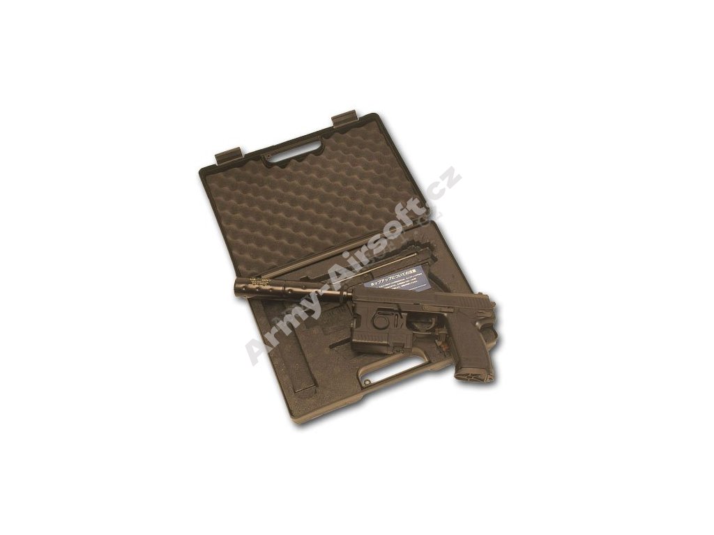 Obsah balení: zbraň, zásobník, transportní kufřík, tlumič, návod