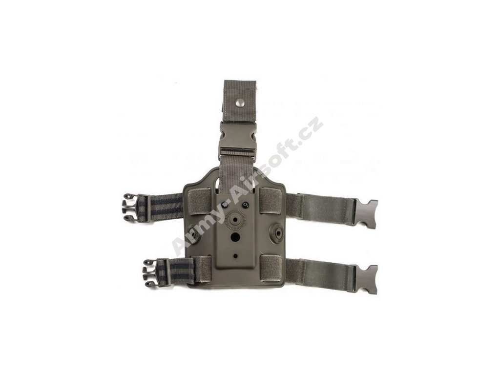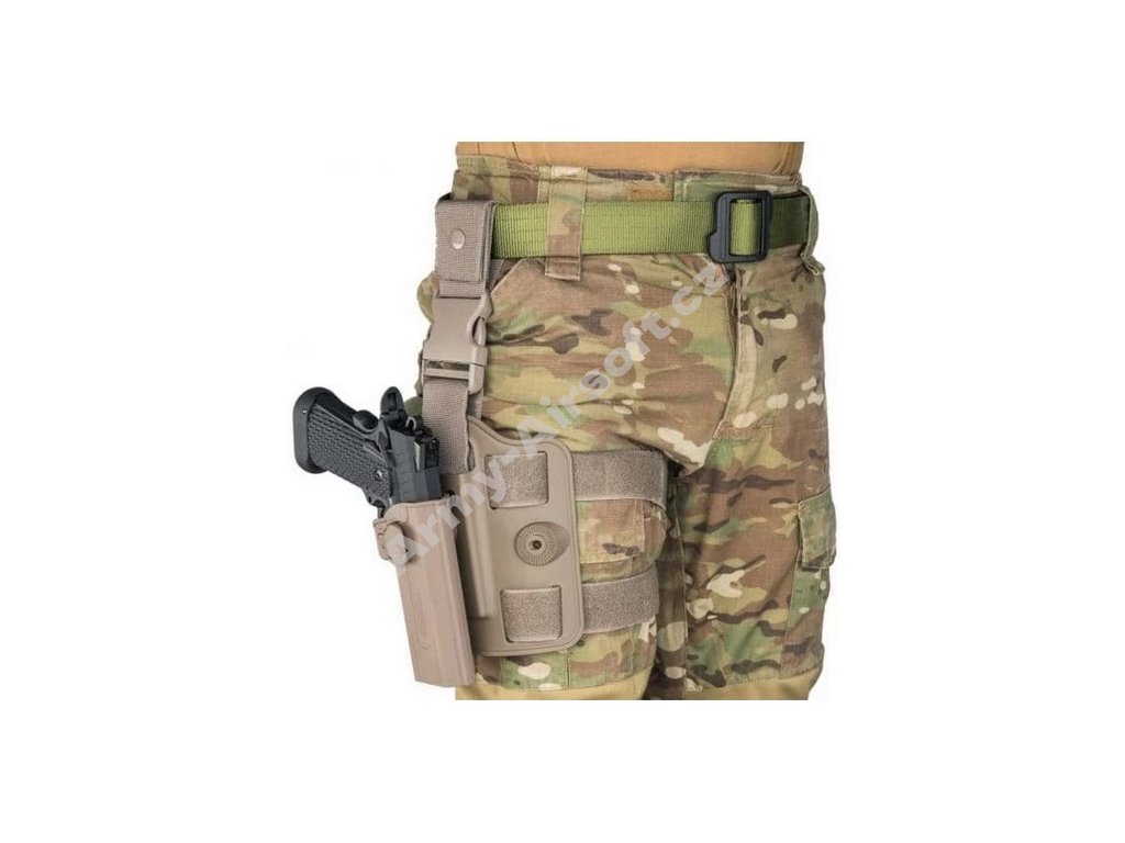Snížená pozice pistole pod linií opasku je ideální při použití nosiče plátů nebo jiné taktické výstroje. Díky kompaktní konstrukci umožňuje platforma pohodlné nošení na levém i pravém stehnu. K dispozici jsou 3 montážní body pro holster nebo sumky, což zajišťuje vysokou flexibilitu konfigurace.