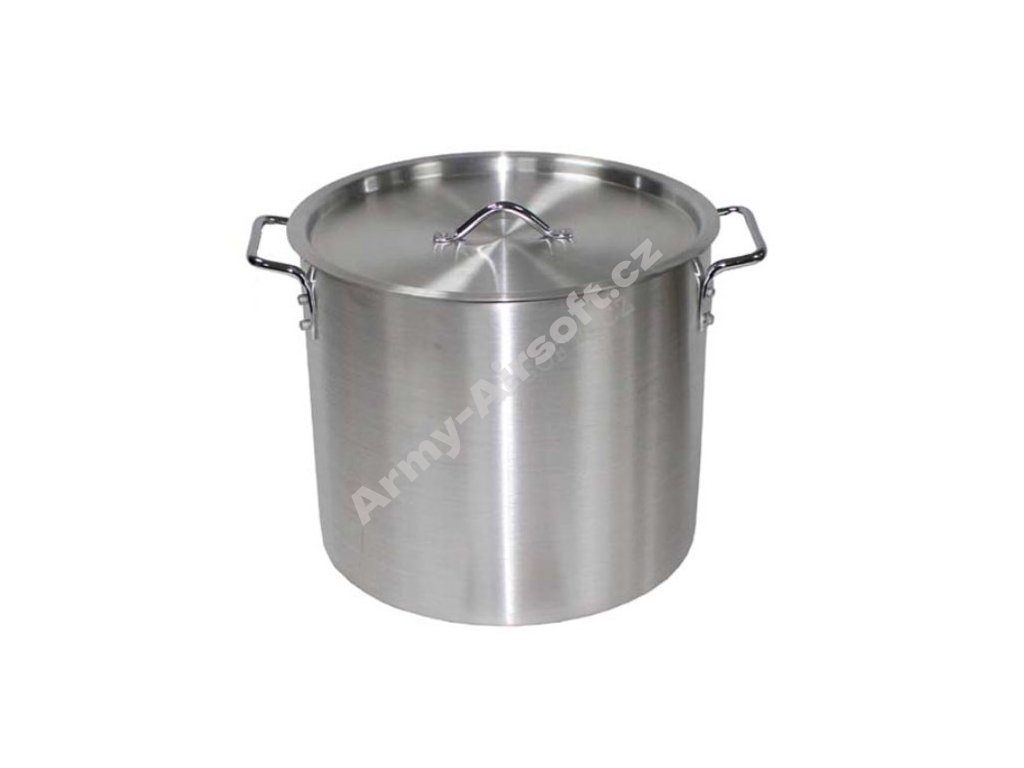 Hliníkový hrnec s poklicí o objemu zhruba 30 litrů.