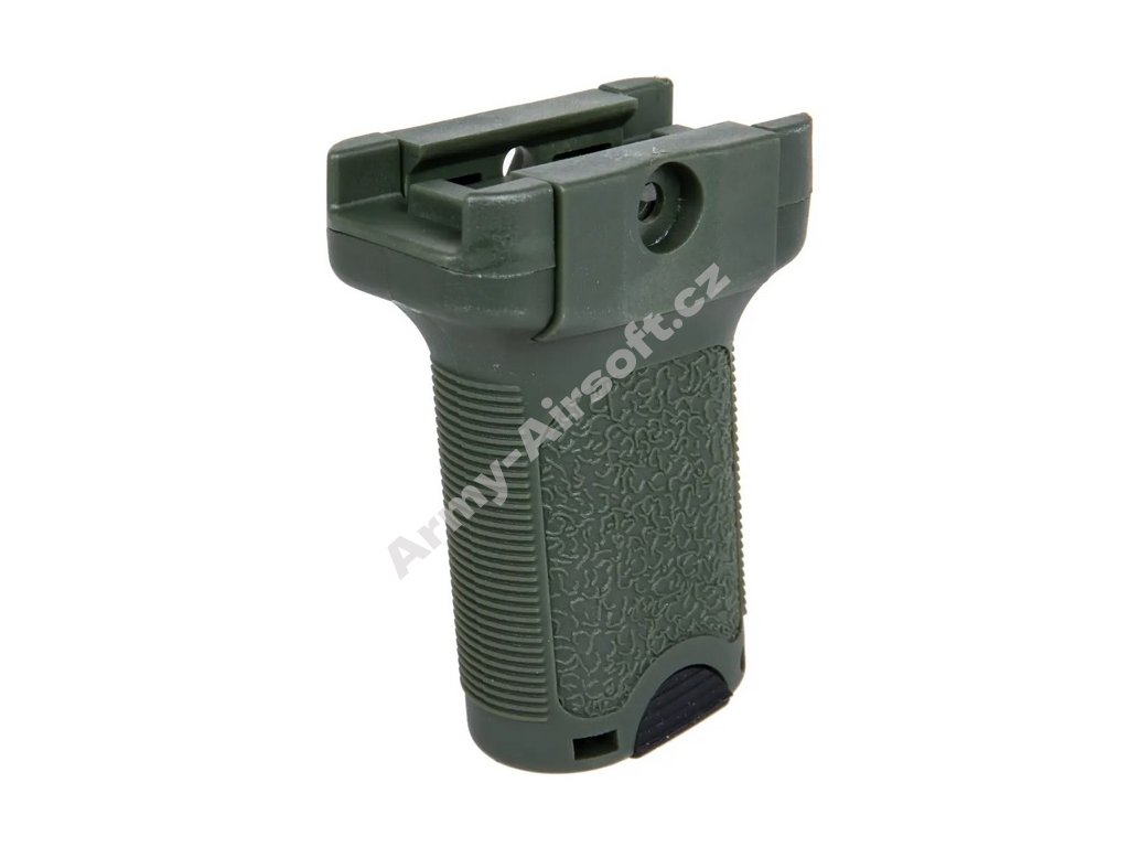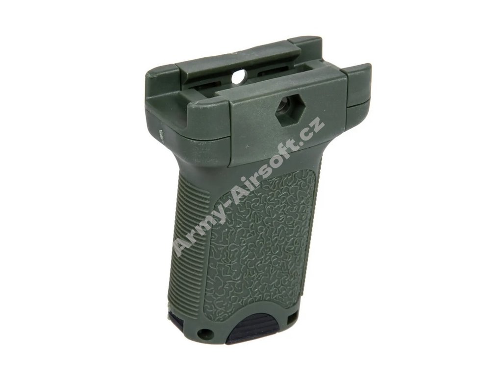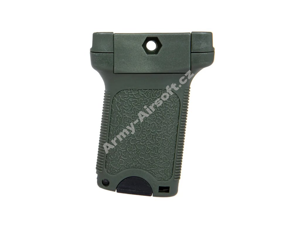 Krátký svislý přední grip z polymeru určený pro karabinu. Grip je potažen protiskluzovou texturou a disponuje vnitřní přihrádkou pro nošení drobných doplňků — např. náhradních baterií pro optiku.