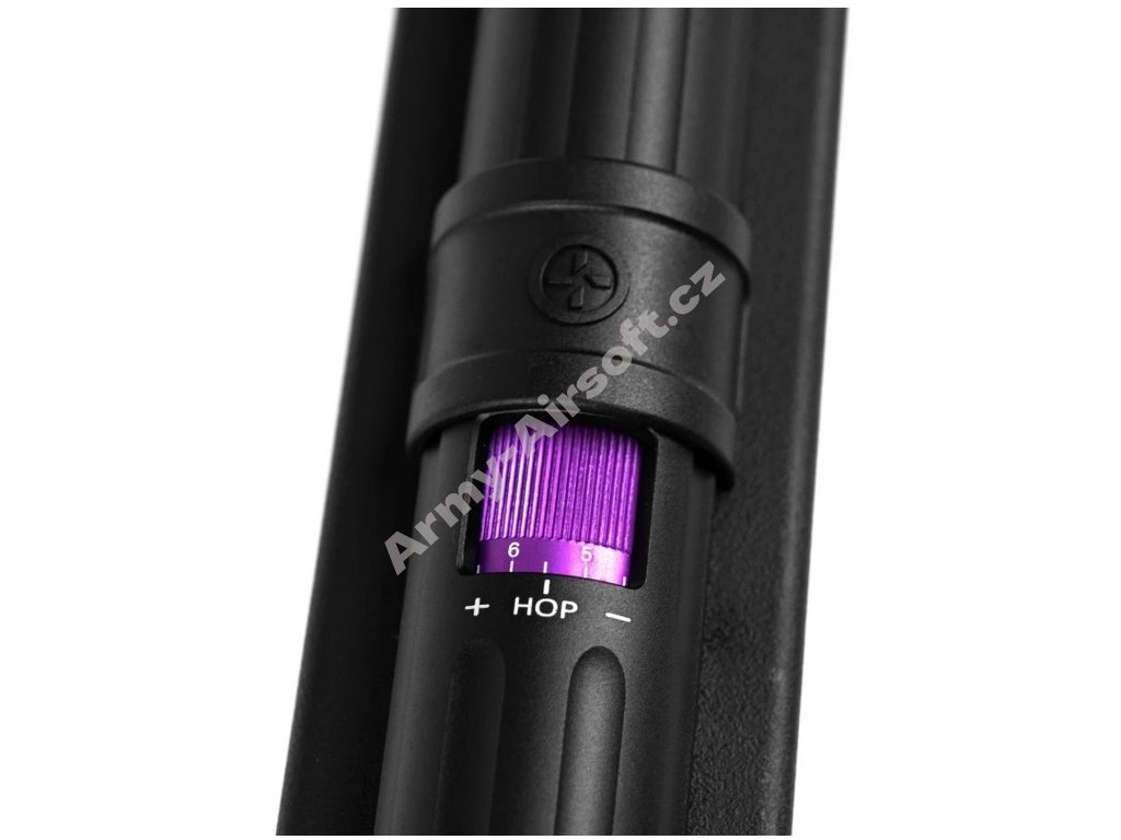 CNC hop-up komora s TDC regulací, FLAT gumička 70°, regulační prstenec na vnější hlavni a posuvná krytka umožňují přesné nastavení i v rukavicích.