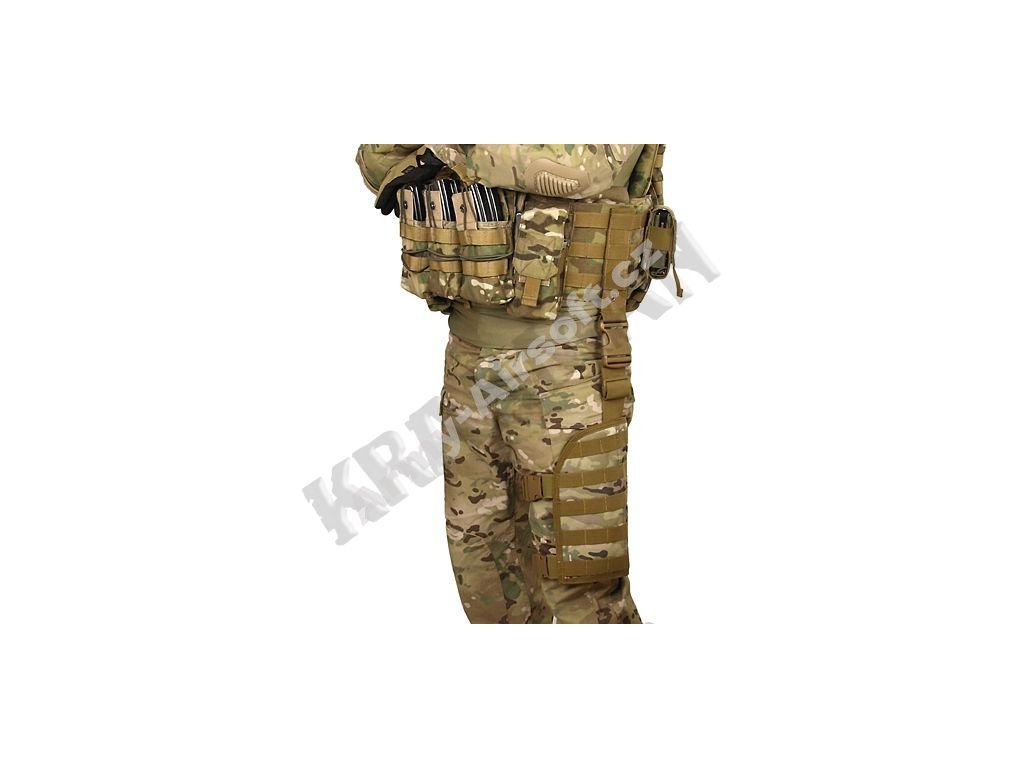 Taktický nožní panel je vyroben z kvalitního nylonu, umožňuje připevnění různých taktických doplňků pomocí systému molle. Panel se upíná jedním popruhem na vestu a dvěma popruhy kolem nohy, takže zůstane na místě i běhěm pohybu. Po výměně popruhu lze také připnout na pásek.